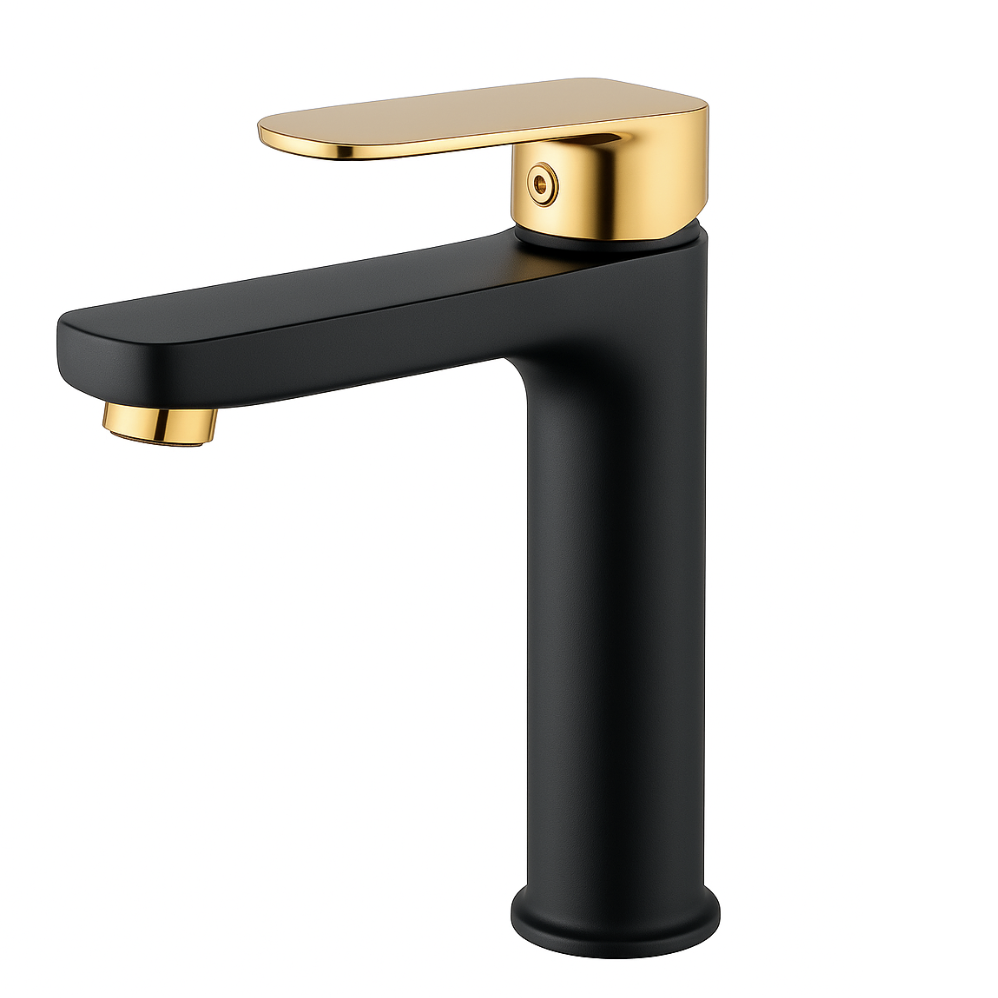 Mat siyah ve altın lavabo bataryası, modern banyolara şık ve sofistike bir dokunuş sunar. Kontrast renk kombinasyonu ile lüks ve estetik bir görünüm sağlar.